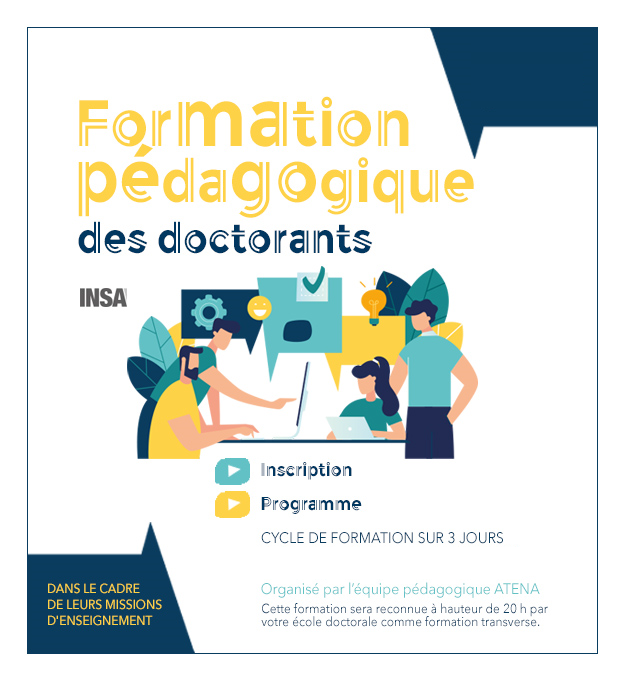 In order to provide a support to teaching profession, INSA Lyon doctoral students who carry out a teaching activity during the preparation of their thesis, and who could exercise the profession of assistant or associate professors in the future, can follow a training in academic pedagogy. This training, lasting a total of 20 hours, is provided by the Support team for teaching, digital and learning techniques "Atena" of INSA Lyon, and is scheduled over 3 sessions between the first year and the 2nd year of the thesis. This training is an introduction to the teaching activity and aims to bring doctoral students an understanding of the profession of university teacher and to develop professional skills essential to exercise this profession. To meet these objectives, the Atena team offers in this training program a panel of workshops encompassing the different skills of university teacher: course design, classroom management, use of pedagogical scenarios, use of digital tools for pedagogy, etc. These reflective and interactive workshops are based on researches in academic pedagogy and on the exchange of pedagogical practices. The validation of the training is obtained by the participation of the doctoral student in the 3 sessions of the training and the presentation of feedback based on his own practice and inspired by the workshops experienced during the training.