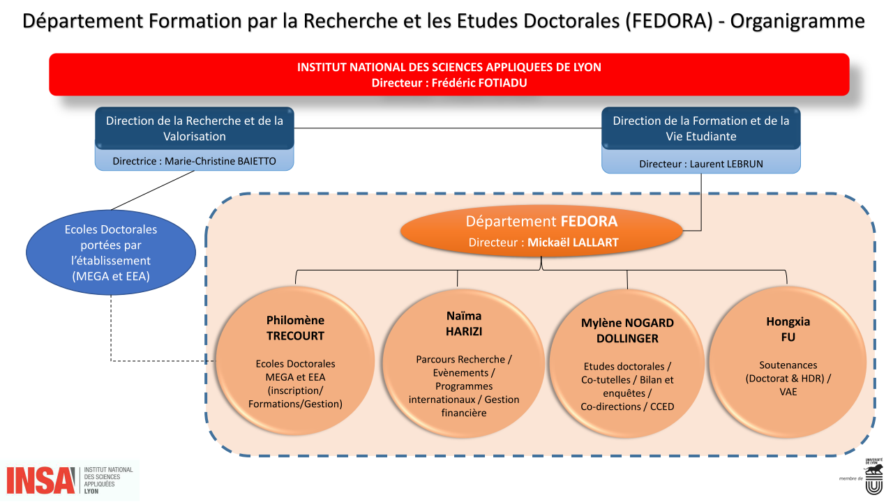 The Department The FEDORA department (Education through Research and Doctoral Studies) includes 4 staff and a director. The organization chart is shown below (click on the image to enlarge).